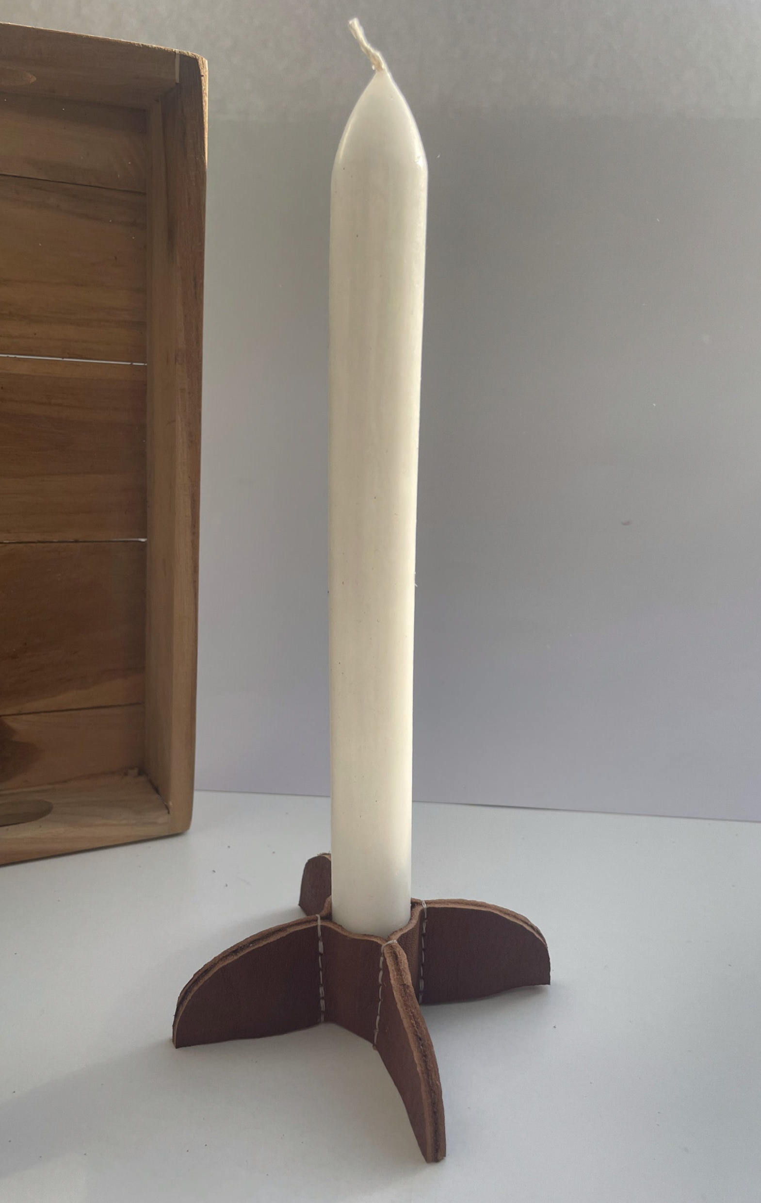 Creëer een warme en luxe sfeer aan tafel met onze handgemaakte leren dinerkaars standaard. De combinatie van stoer leer en sfeervol kaarslicht zorgt voor een unieke en tijdloze uitstraling, perfect voor een romantisch diner, een feestelijke tafelsetting of een gezellig avondje thuis.