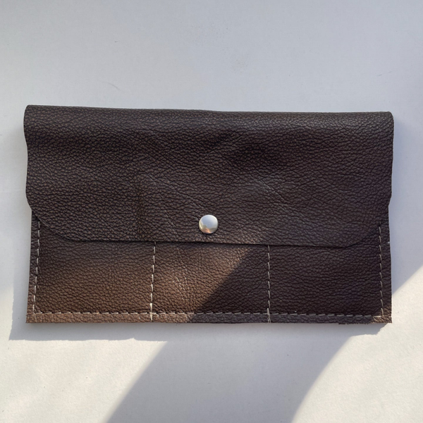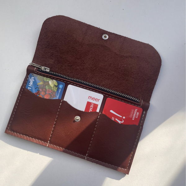 De portemonnee gaat dicht met een drukknoop. Hij heeft 3 vakjes voor pasjes, een ritsvak en open ruimte voor briefgeld of zelfs een telefoon.