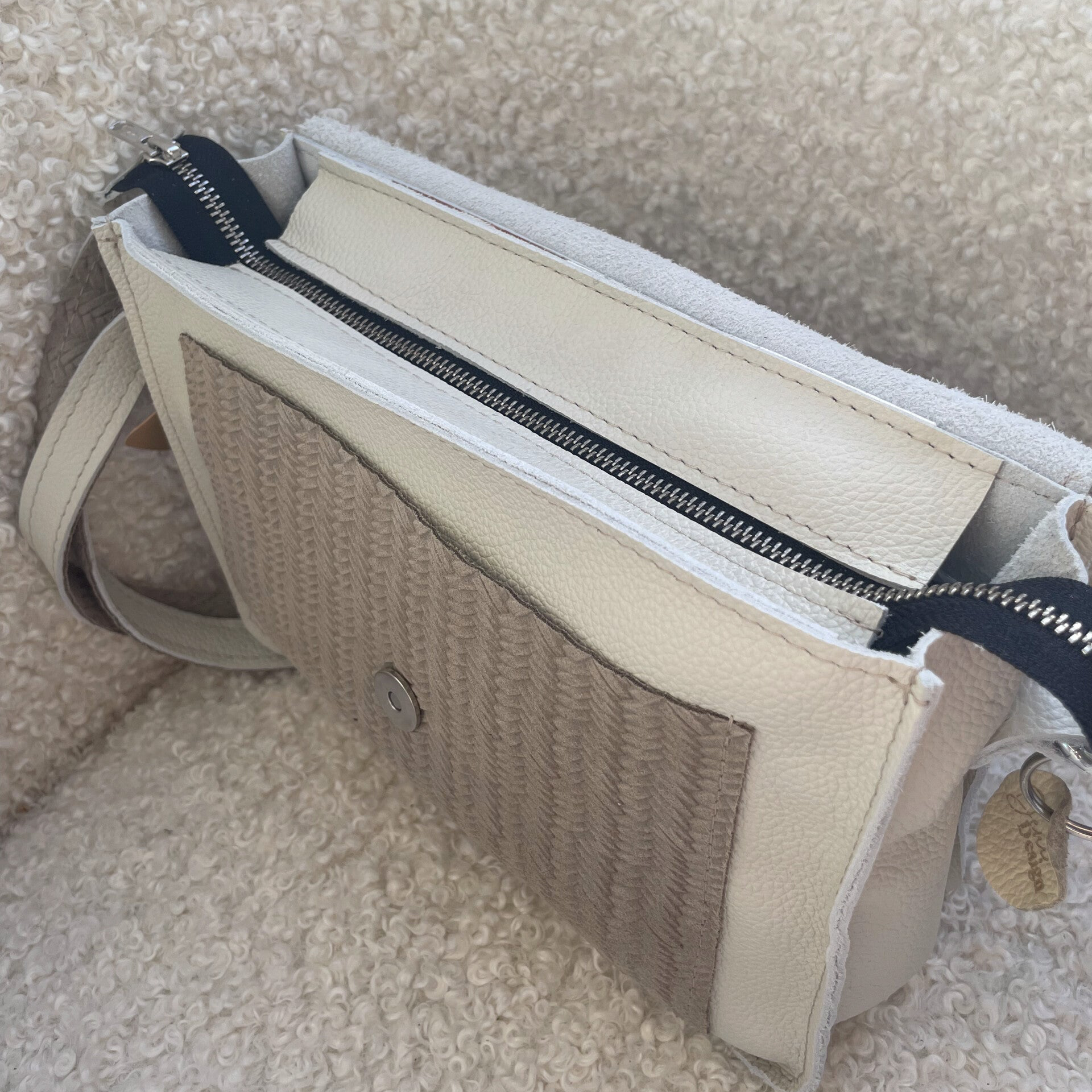 De tas heeft een vak op de voorkant en aan de binnenkant nog een ritsvakje voor kleine spulletjes die je veilig wil opbergen. De tas is uitgevoerd met 2 sluitingen, magneetslot en rits, en is dus goed beveiligd.